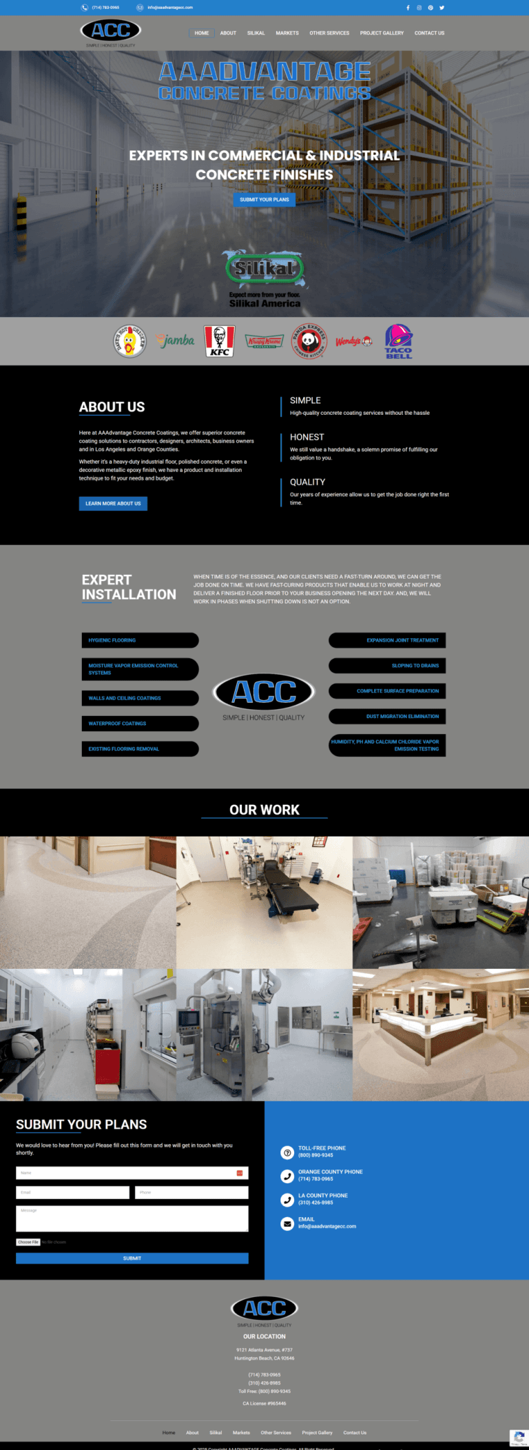 We built a professional WordPress website for AAAdvantage Concrete Coatings to showcase their expertise in commercial and industrial flooring. The homepage emphasizes trust and experience with featured client logos, clear service messaging, and a gallery of real project installations. With mobile-responsive design, custom copywriting, and clean visual structure, the site reflects the company’s straightforward values — simple, honest, quality.