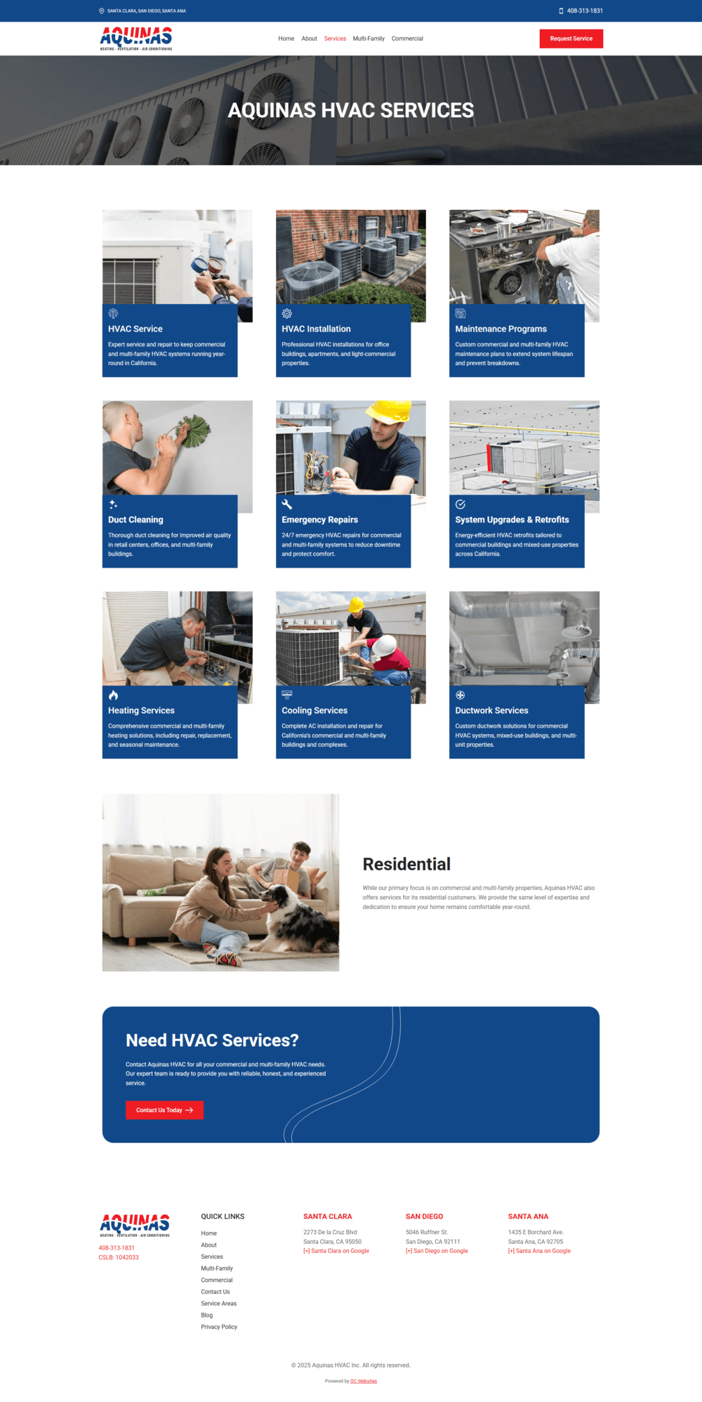 The redesigned Services page gives visitors a clear, structured overview of Aquinas HVAC’s full range of offerings. Each service is presented in a visually distinct card layout with stock images, icons, short descriptions, and intuitive navigation to deeper pages.