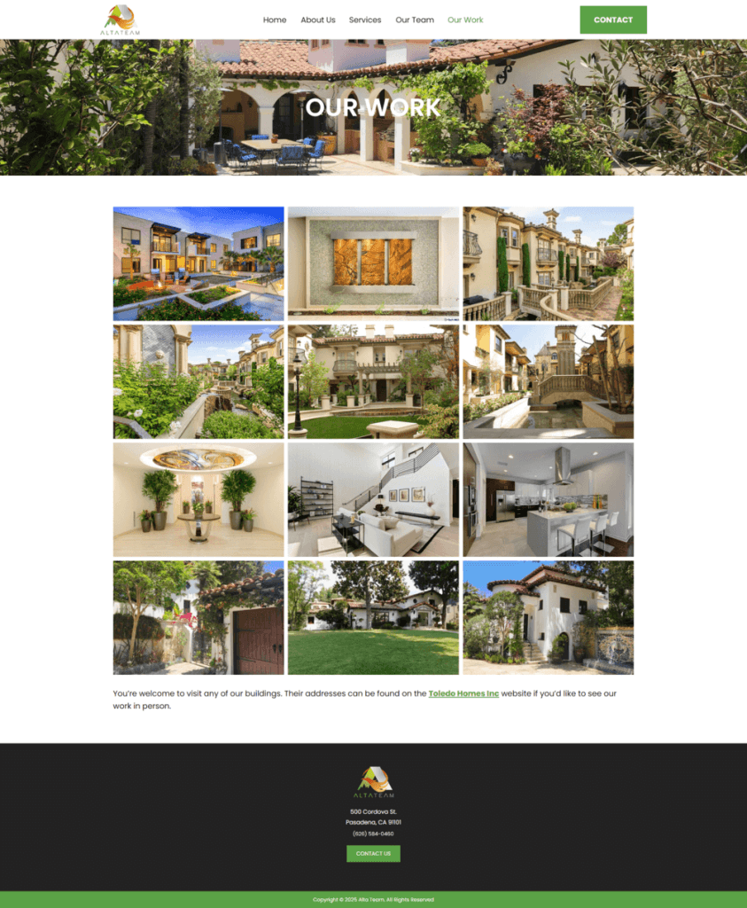 The “Our Work” gallery showcases completed rebuilds and residential projects with large, high-quality imagery. Designed for clarity and impact, it highlights Alta Team’s architectural precision and attention to detail, reflecting their commitment to helping homeowners rebuild stronger than before.