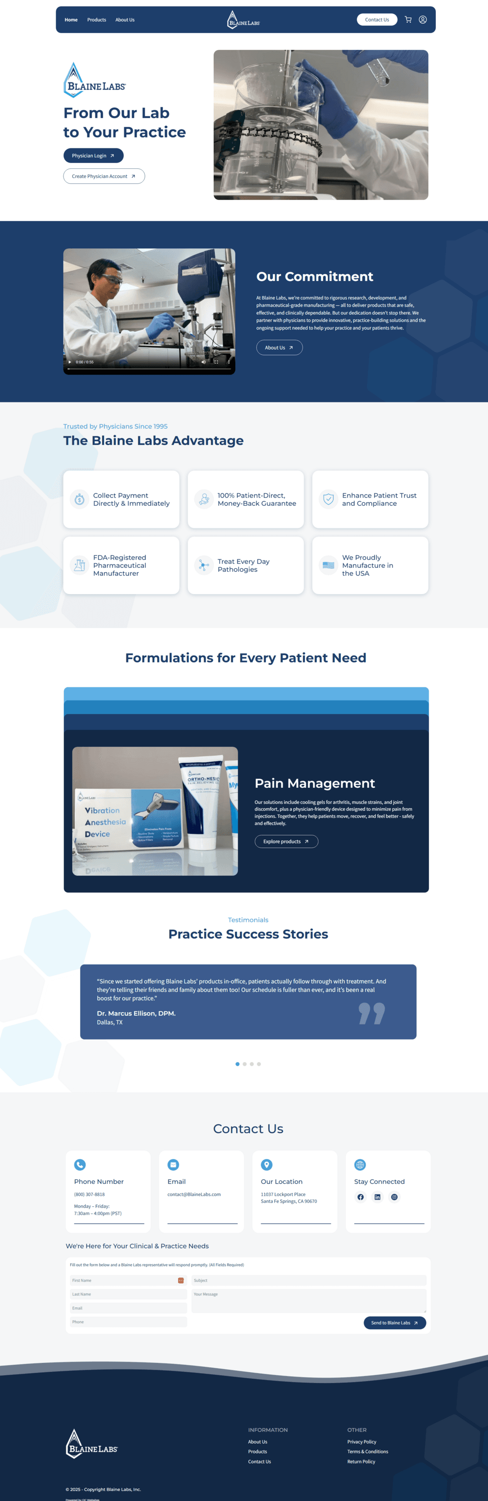 Blaine Labs is an FDA-registered pharmaceutical manufacturer serving physicians nationwide. The company partnered with us to modernize its digital platform and streamline physician ordering through a secure, physician-only ecommerce system. The new site reflects Blaine Labs’ 30-year legacy with a modern, mobile-responsive design and an interface that mirrors the professionalism of the medical community.