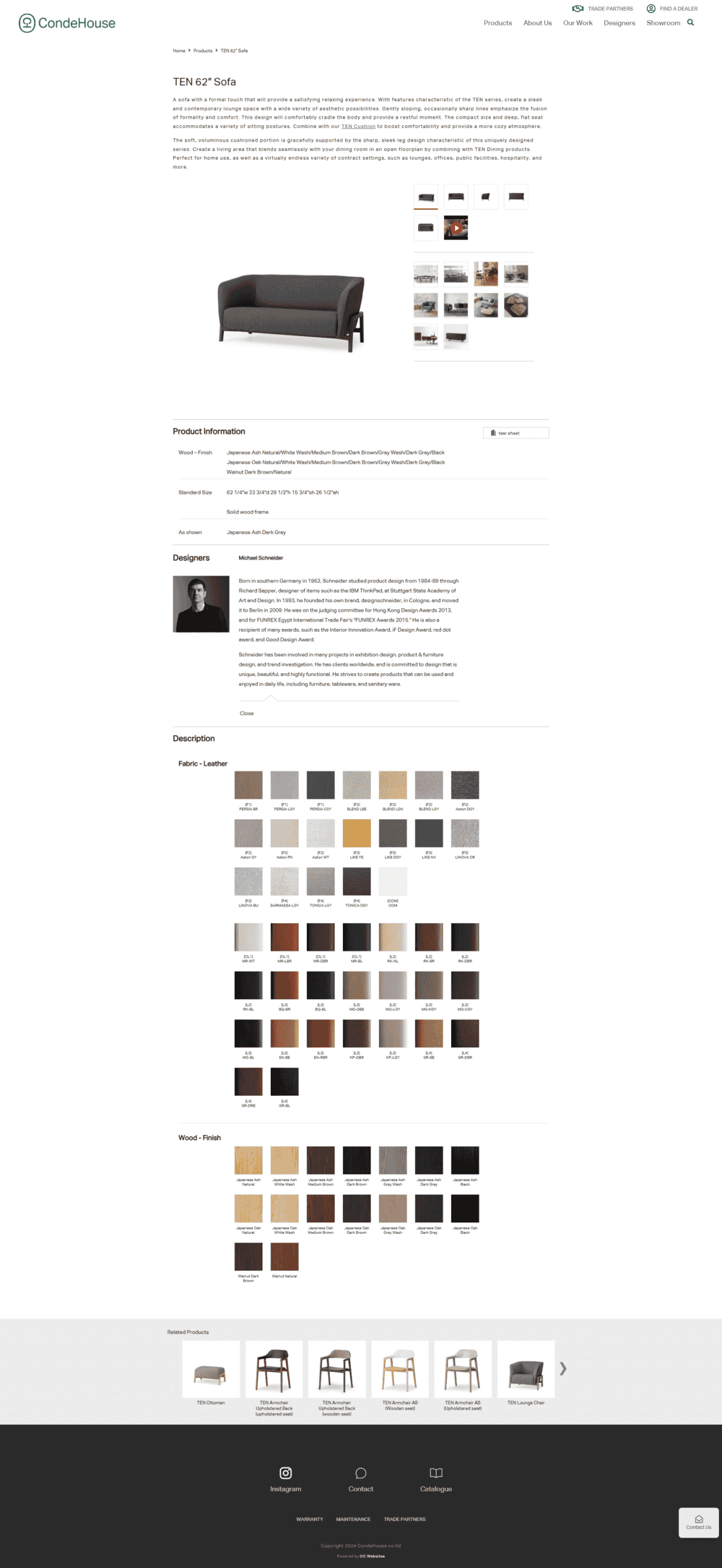 Each product page was built to support dynamic fabric and wood finish swatches, allowing users to easily explore material variations within a structured layout. This flexible configuration system enables CondeHouse to update finishes and specifications efficiently while maintaining a refined, high-end product presentation.