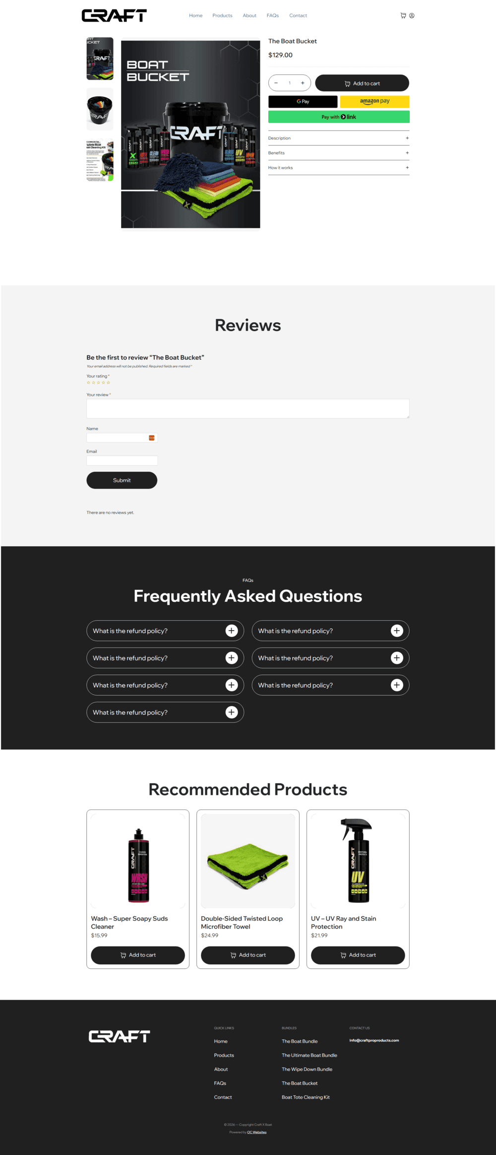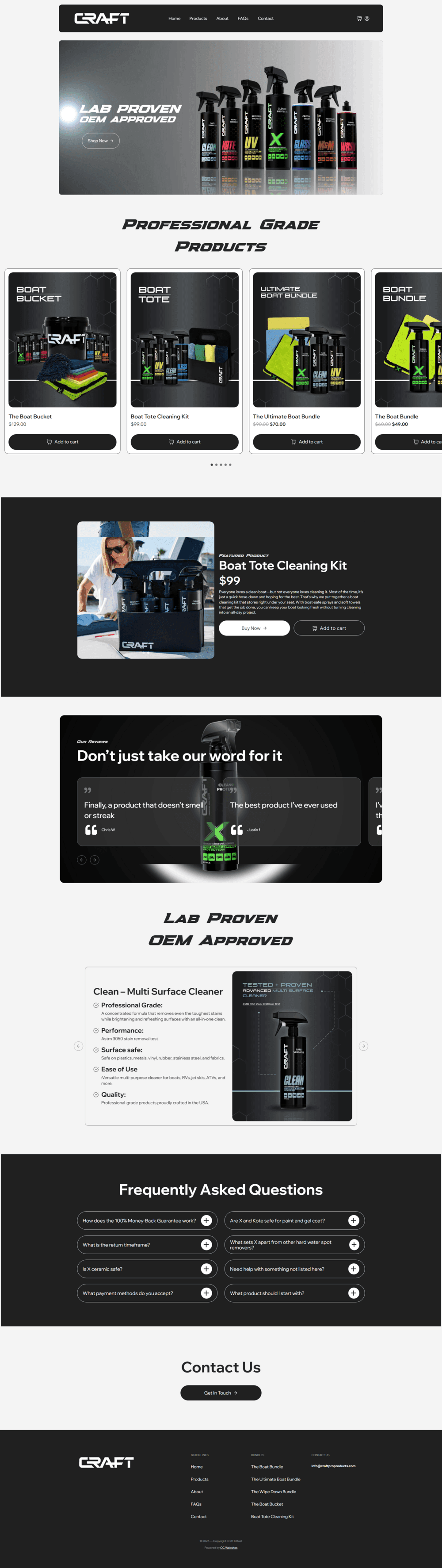 CRAFT is a premium boat cleaning brand offering professional-grade products designed for real-world use on the water. We partnered with CRAFT to build a modern ecommerce website that clearly presents its product line, supports bundled offerings, and delivers a streamlined shopping experience. The site balances strong visual branding with a clean, conversion-focused layout, allowing customers to quickly understand each product and purchase with confidence.