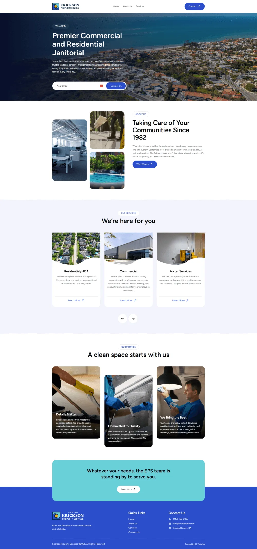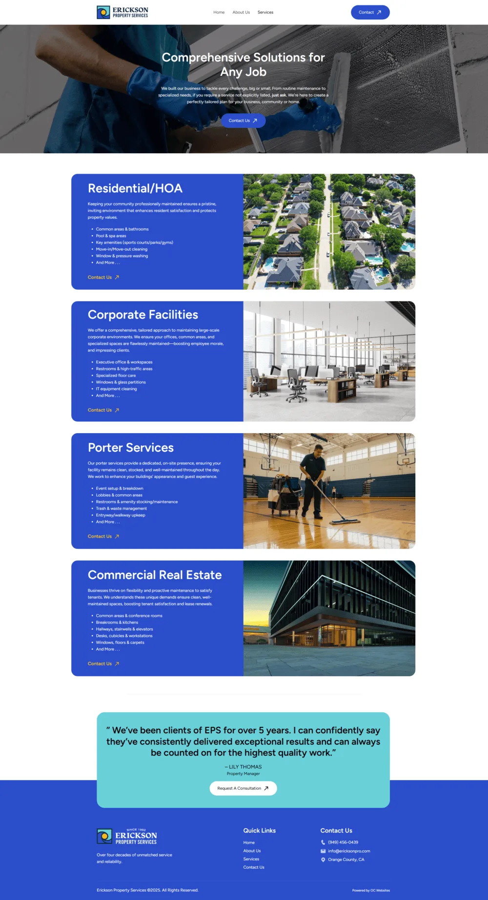 The Services page highlights Erickson’s comprehensive janitorial capabilities, including Residential/HOA, Corporate Facilities, Commercial Real Estate, and Porter Services. Each section combines photography with clean service blocks, creating a clear, user-friendly overview that reinforces the company’s commitment to excellence and attention to detail.
