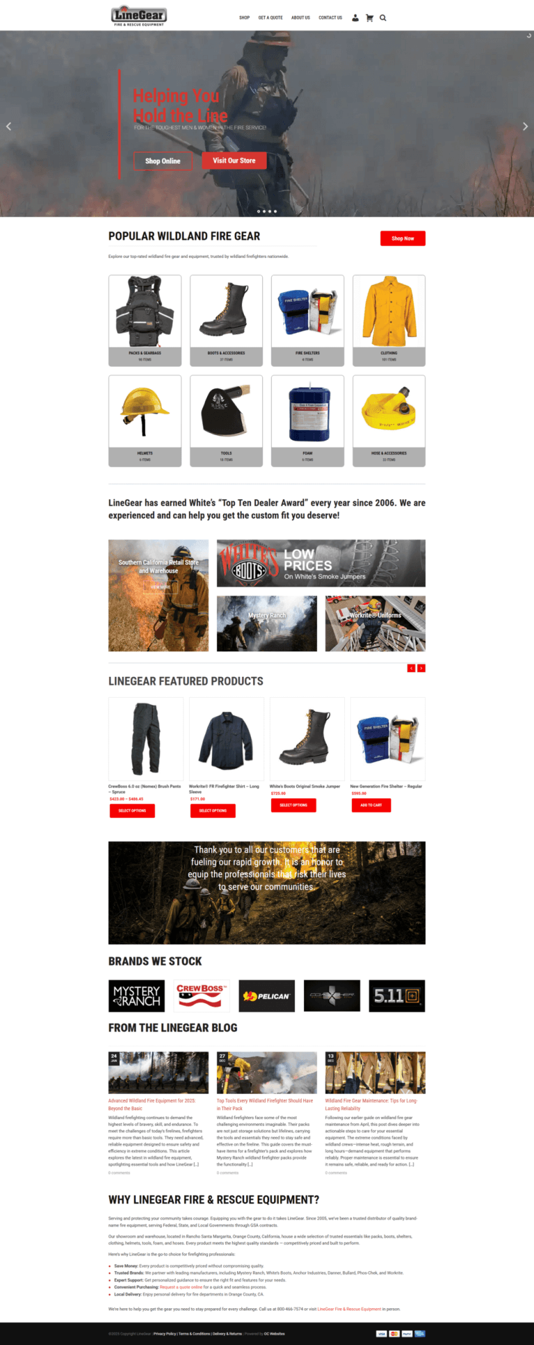 LineGear Fire & Rescue Equipment is a leading distributor in the fire service industry and a trusted supplier to the U.S. Federal Government through GSA. Collaborating with LineGear, our goal was to create a timeless, professional ecommerce website that elevated both design and functionality while improving organic visibility. The result is a durable, high-performing online platform that reflects the company’s leadership and long-standing reputation in the wildland firefighting community.
