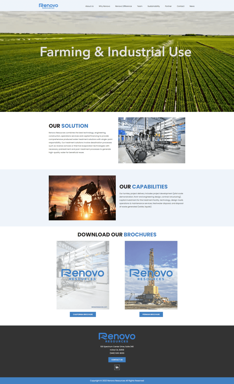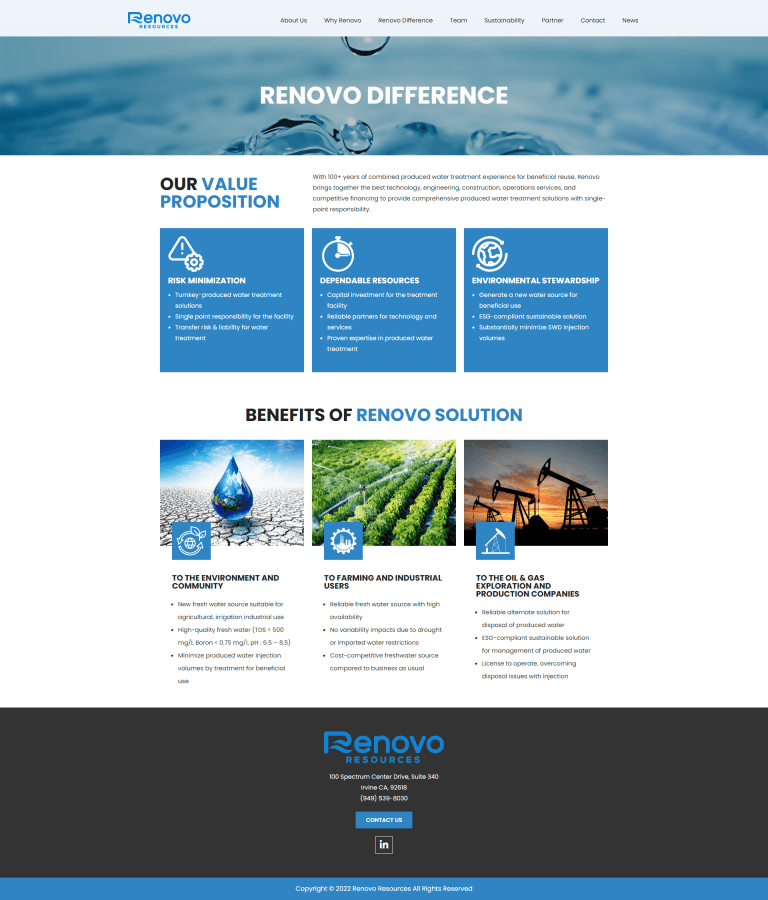 The Renovo Difference page communicates Renovo’s value proposition through focused messaging and cohesive visuals. Icon highlights emphasize reliability, risk minimization, and environmental stewardship, while imagery reinforces their leadership in sustainable water management.