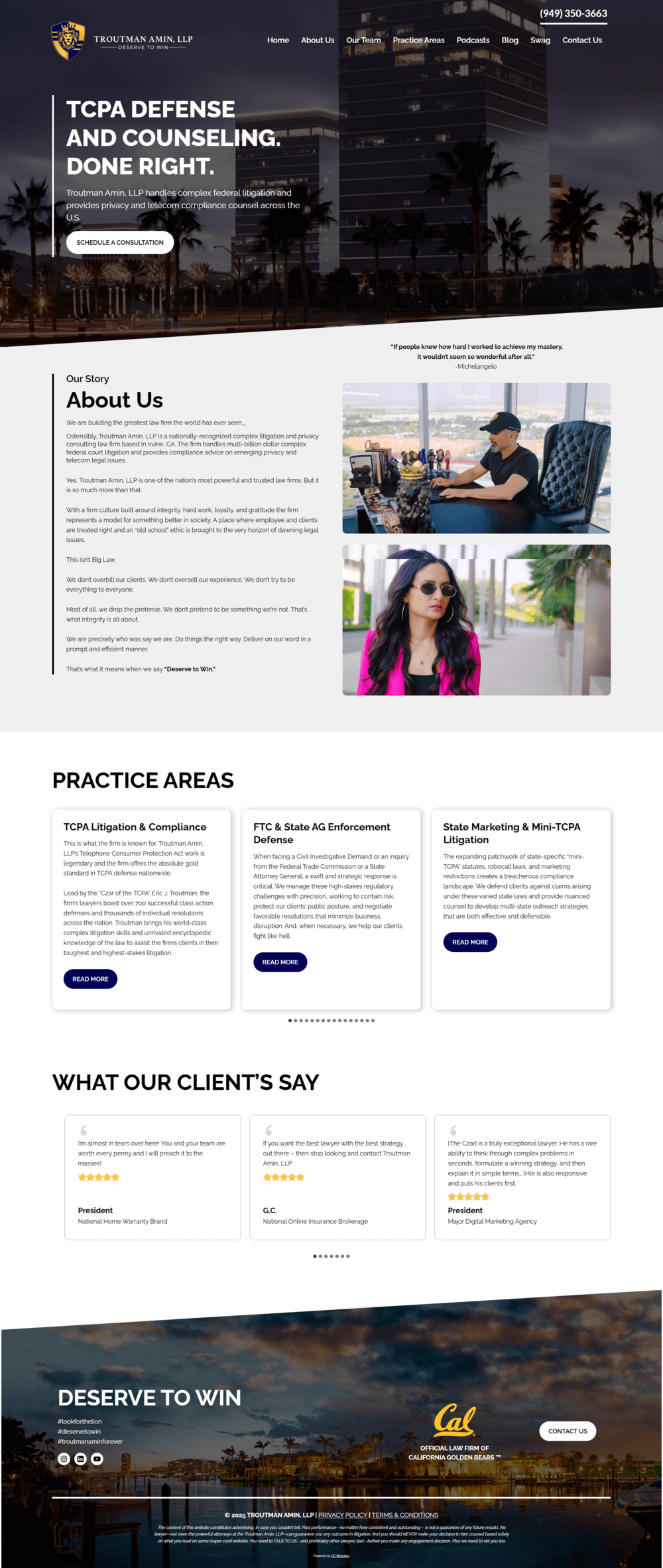 Each team page features embedded video headers and custom layouts that bring the firm’s attorneys to life. Eric J. Troutman’s page—“The Czar”—sets the tone with cinematic visuals and a confident, narrative style that mirrors his national prominence in TCPA defense and thought leadership. Together, these pages elevate Troutman Amin’s brand as a top-tier, forward-facing law firm built on clarity, precision, and performance.